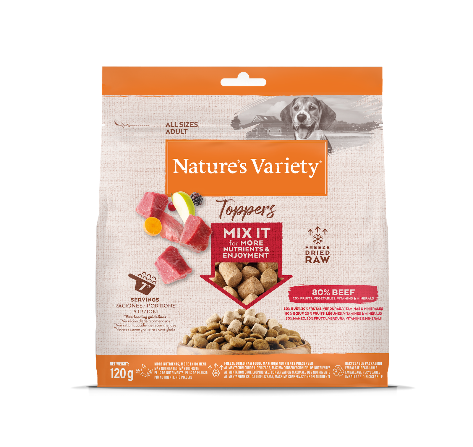 Nature’s Variety Toppers liofilizuoti pašaro paskaninimai su jautiena. Šuo nenoriai valgo ir žiūri į savo pašarą? Mes sukūrėme produktą, kuris paskanins, bet kokį pašarą. Užberkite Nature’s Variety Toppers ant savo šuns pašaro ir stebėkite kaip tuštėja pašaro dubenėlis.