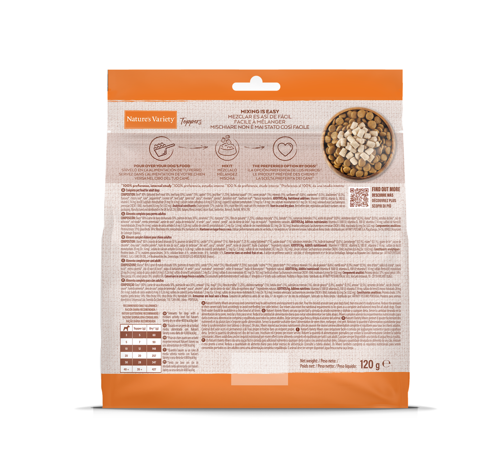 Nature’s Variety Toppers yra paprastas ir patogus būdas papildyti, bet kokią mitybą maistinėmis medžiagomis ir suteikti augintiniui pasimėgavimo. Supilkite norimą kiekį turinio ant šuns pašaro, sumaišykite ir jis paruoštas patiekti. Atitinkamai sumažinkite šuns kasdieninio pašaro kiekį, kad būtų išvengta persivalgymo (žr. rekomenduojama šėrimo lentelę ant pakuotės). Toppers atitinka visus šunų mitybos reikalavimus, tad gali būti naudojamas, kaip visavertis ir subalansuotas pašaras visiems šunims. Laikyti sausioje vėsioje vietoje. Visada turi būti šviežio vandens švariame dubenėlyje.